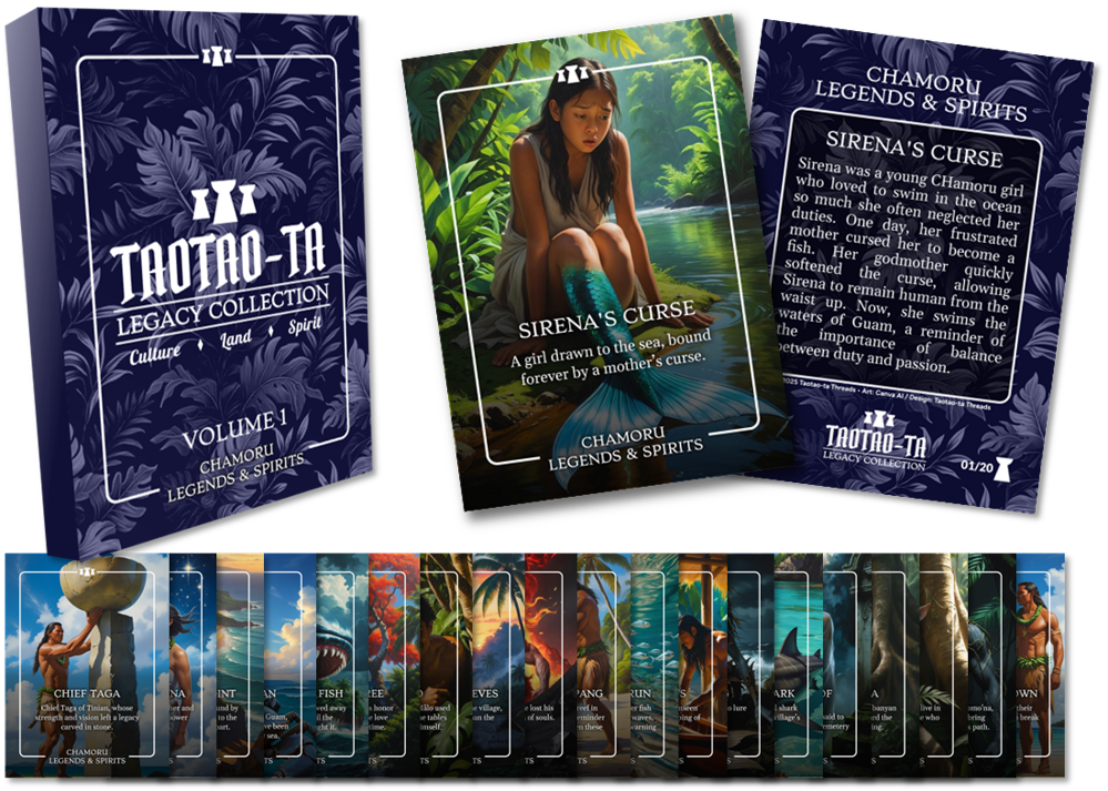 A tribute to the stories, places, and spirit of the CHamoru people. Each volume features 20 collectible cards that share cultural knowledge, legends, and historical insight from the Mariana Islands—home of the CHamoru people. Designed to educate, inspire, and preserve heritage through art and storytelling. The journey begins with Volume 1: CHamoru Legends and Spirits.